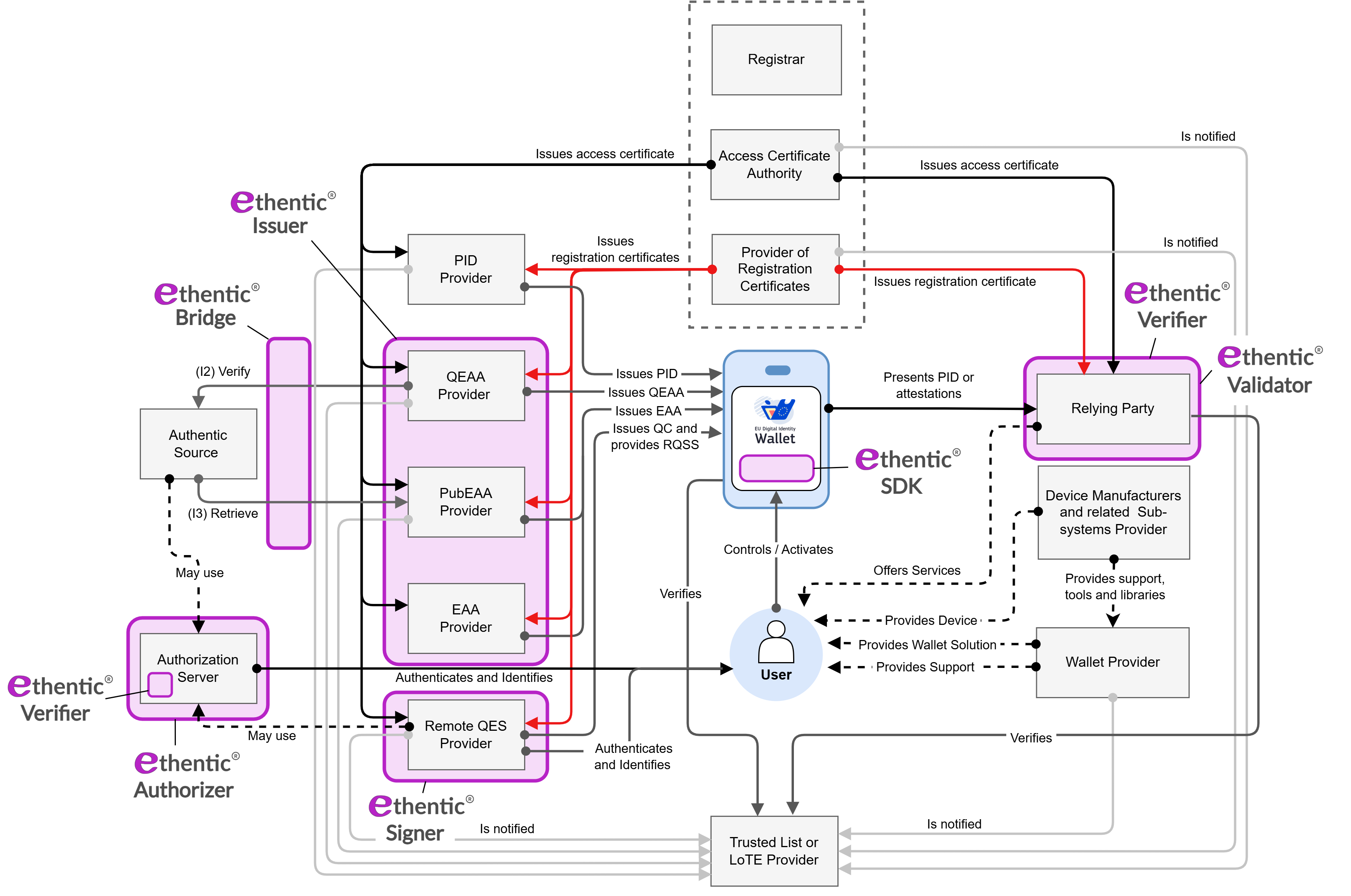 The ethentic® SDK is a comprehensive platform independent Software Development Kit (SDK), which makes it easy to create wallets for natural and legal persons, such as European Digital Identity Wallets or European Business Wallets for example, or similar tailor-made applications on various platforms including Android, iOS, Windows, macOS and Linux for example. It provides a comprehensive and flexible framework for the secure storage and application of cryptographic keys in trusted execution environments, smart cards and other cryptographic hardware devices and supports the issuing, requesting, obtaining, selecting, combining, storing, deleting, sharing and presenting of verifiable credentials and electronic attestations of attributes as well as the creation and validation of electronic signatures, seals and time stamps.